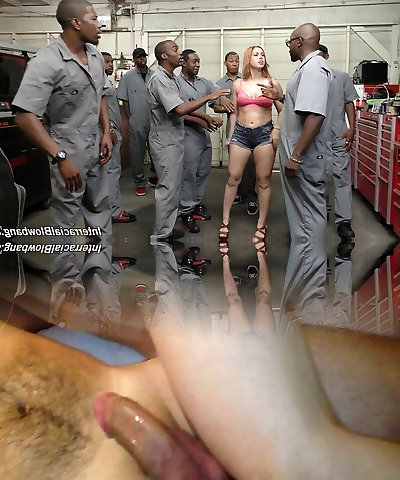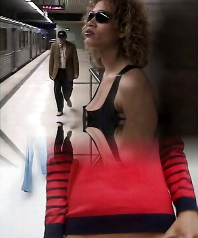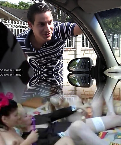 Thong-clad whore with long dark hair and humungous natural tits giving a stranger an awesome blowjob