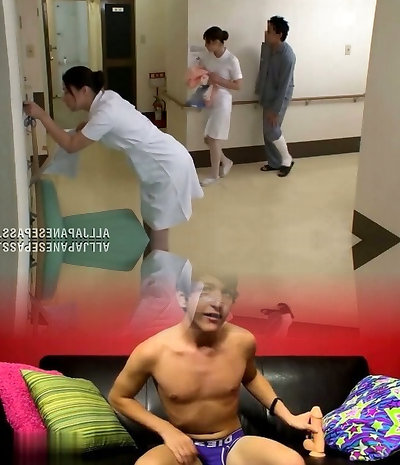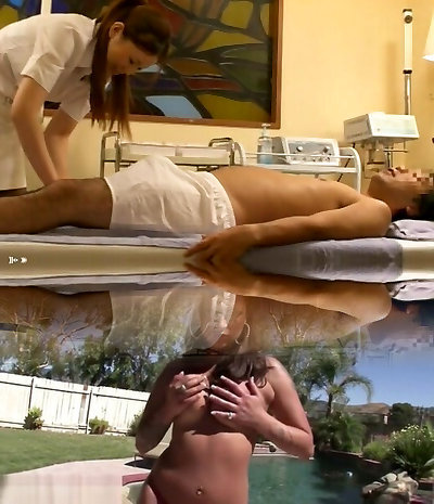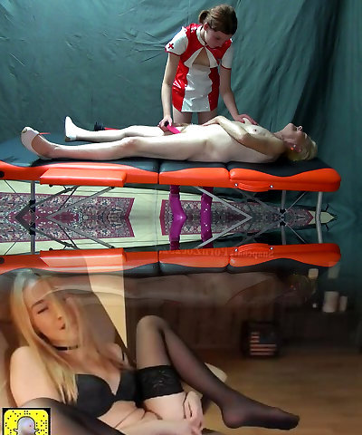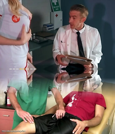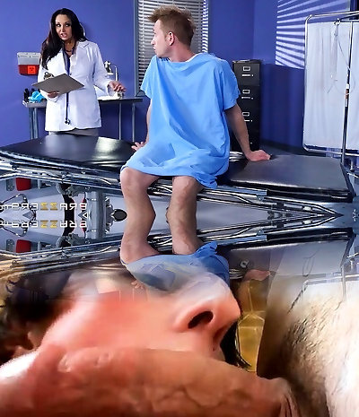 Beautiful brunette nurse probes bald stud's anal cavity with her fingers, toes and big string-on