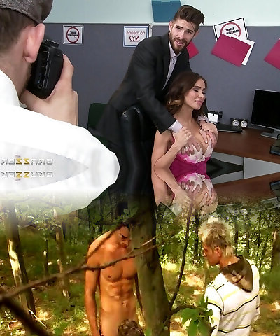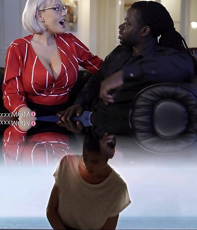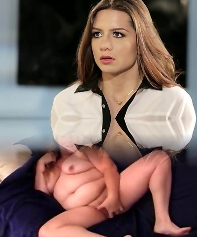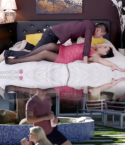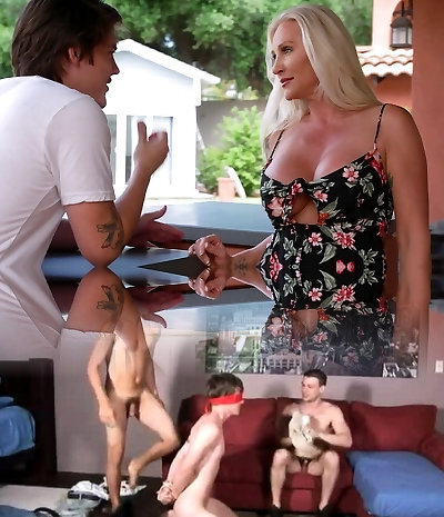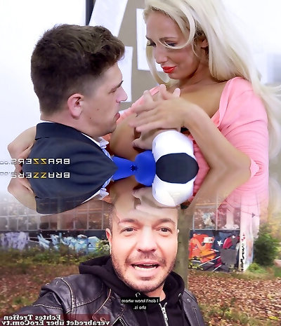 A hot blondy milf clad in lace underwear with humungous real boobs swallows and fucks in a motel
