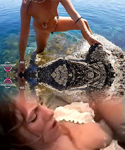 nippleringlover horny milf extraordinary pierced nipples and pussy swimming bare at public beach